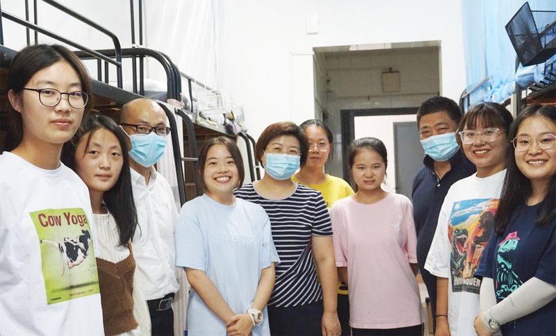 10月4日下午,外国语云顶娱乐城 党委书记朱小娟、院长陆国君,党委副书记、副院长陈俊怀带领全体辅导员深入新生宿舍,亲切看望2021级新同学。