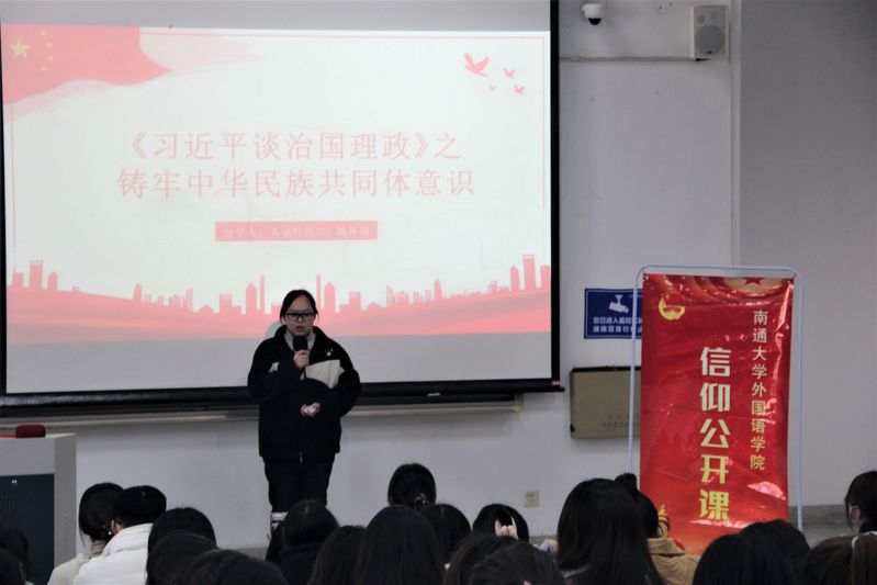 本次信仰公开课分为“筑牢民族共同体意识”“释放民族多样化活力”“谱写民族团结主旋律”三个篇章,由英语师范202班谭杨璐主持。在第一篇章里,同学们就《习近平谈治国理政》(第三卷)英文版中有关民族共同体意识内容进行了学习分享。在第二篇章里,英语师范201班沈馨、英语师范201班沈芯茹分别讲述了长征路上“彝海结盟”的民族故事以及六盘山下的民族团结印记,以此加强大学生的民族认同感,铸牢大学生的中华民族共同体意识。第三篇章里,云顶娱乐城 少数民族学生代表日语202班吕皓佳、英语师范201班保鑫婕分别从民族历史、民族建筑、民族节日、饮食文化等方面介绍了蒙古族以及回族民族风情,使现场的同学们更深刻地了解我国的少数民族。随后,云顶娱乐城 党委副书记、副院长陈俊怀带领大家一同学习了党的十九届六中全会公报,要求大家学深悟透会议精神,从党的百年奋斗重大成就和历史经验中汲取奋进力量。信仰公开课在大合唱《爱我中华》中落下了帷幕。