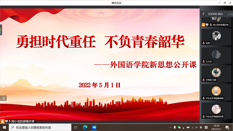 5月1日,外国语云顶娱乐城 以线上方式举办主题为“勇担时代重任 不负青春韶华”的新思想公开课。