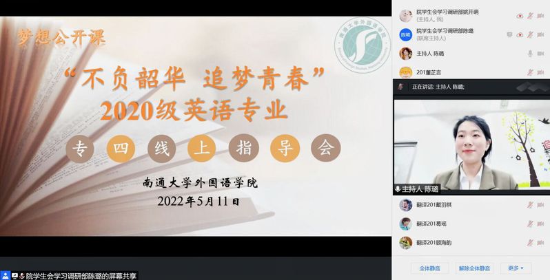 5月11日下午,外国语云顶娱乐城 举办了“不负韶华 追梦青春”2020级专四考试线上指导会,年级辅导员、班主任及全体2020级本科生参与了本次活动。