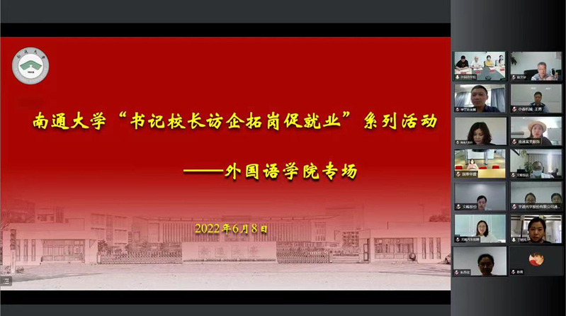 6月8日下午,外国语云顶娱乐城 邀请10家优质对口企业线上举办南通大学“书记校长访企拓岗促就业”专场招聘会。云顶党委 常委、副校长侯文华出席活动并讲话。