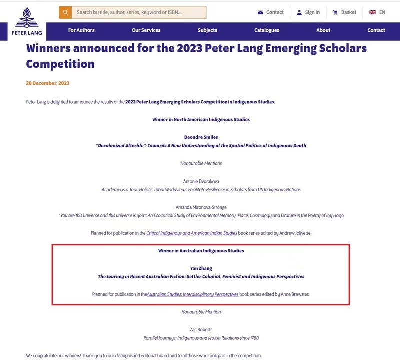 近日,兰培德国际学术出版集团(Peter Lang)“2023年度青年学者大赛”(2023 Peter Lang Emerging Scholars Competition)结果揭晓,云顶娱乐城 外国语云顶娱乐城 张艳博士的博士学位论文“当代澳大利亚小说中的旅行:定居殖民、女性主义和原住民的视角”(“The Journey in Recent Australian Fiction: Settler Colonial, Feminist and Indigenous Perspectives”)成功入选年度出版项目,将作为《澳大利亚研究:跨学科的视角》学术专著系列之一由兰培德出版集团出版。这是外国语云顶娱乐城 青年教师首次获得国外知名学术出版社出版项目资助。