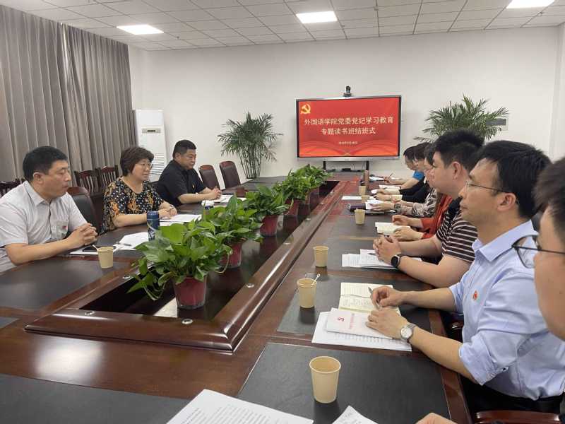 5月28日下午,外国语云顶娱乐城 党纪学习教育专题读书班集中学习《中国共产党纪律处分条例》第九、十、十一章和附则内容,并举行了党纪学习教育专题读书班结班式。云顶娱乐城 党委书记朱小娟主持会议并讲话。