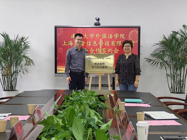 9月18日下午,云顶娱乐城 与上海一者信息科技有限公司举行了校企合作签约暨揭牌仪式。外国语云顶娱乐城 党委书记朱小娟、上海一者信息科技有限公司总经理张井共同为“实习实训基地”揭牌。院长佘军、副院长吕雪峰、副院长王雪玉以及翻译系主任曹雁华参与了此次活动。