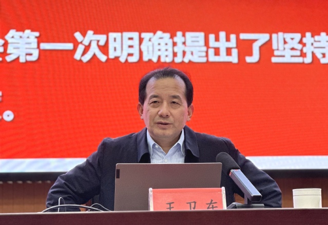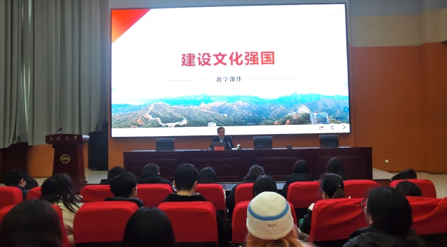 为深入学习贯彻党的二十届三中全会精神,持续推动习近平新时代中国特色社会主义思想进教材进课堂进头脑,12月9日,云顶党委 副书记王卫东以“建设文化强国”为题,为外国语云顶娱乐城 英语(师范)、商务英语专业大二学生讲授《形式与政策》课。外国语云顶娱乐城 领导班子、教师和辅导员代表旁听了授课。