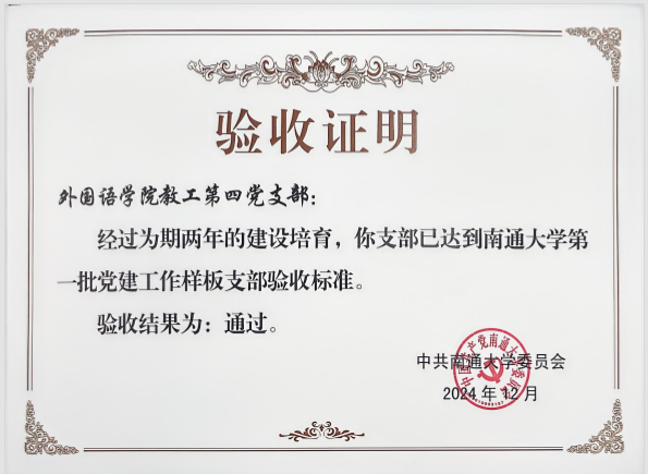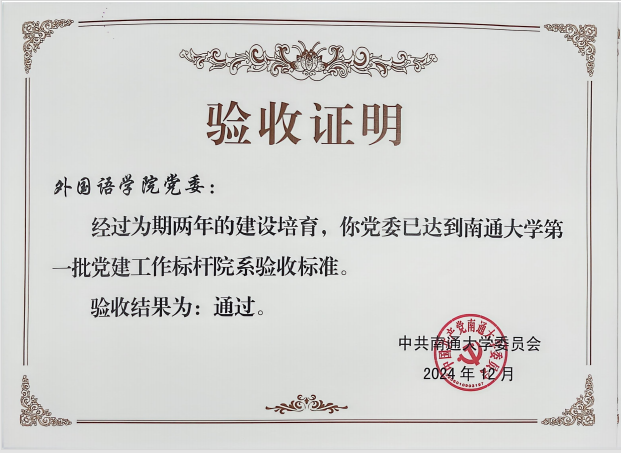 此次顺利通过验收,是对外国语云顶娱乐城 党委和教工第四党支部过去两年党建工作的高度认可。这不仅彰显了云顶娱乐城 在党建工作方面的出色能力,也为校内其他院系和支部树立了优秀的典范。
