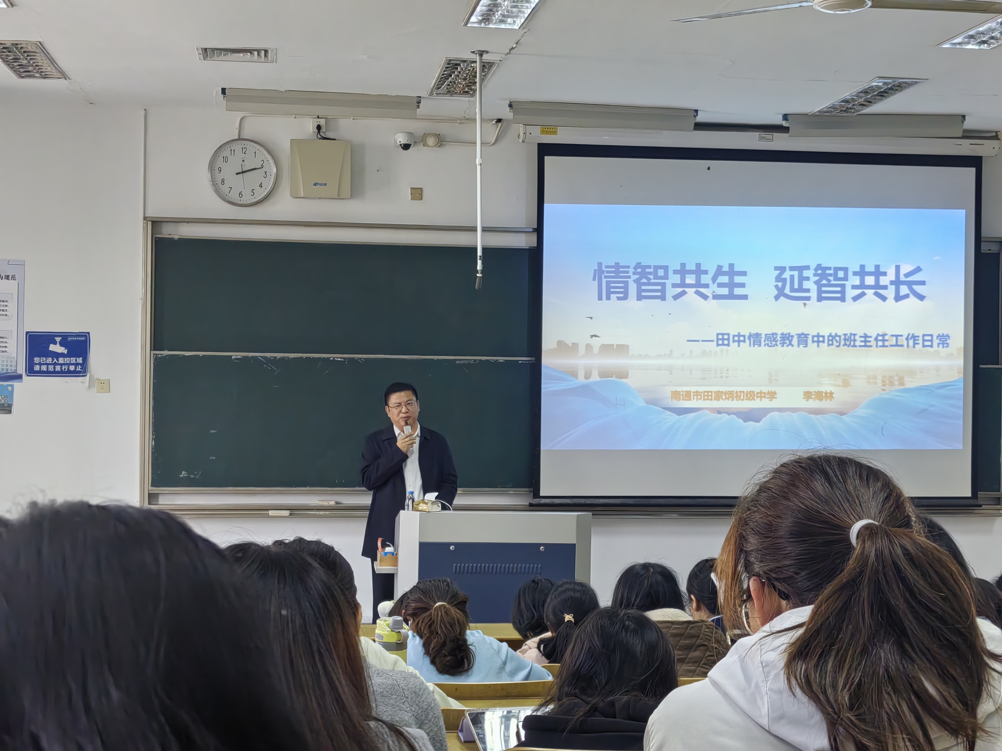 11月5日下午,外国语云顶娱乐城 面向英语(师范)专业学生举办以“情智共生、延智共长”为主题的中学班主任经验分享会。南通市田家炳初级中学资深班主任李海林老师应邀为云顶娱乐城 师范生分享其三十余年的班级管理智慧,助力未来教师夯实育人理念、提升实践能力。
