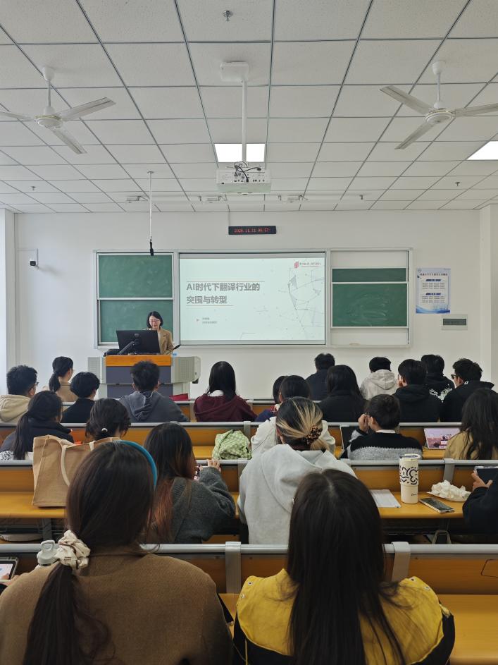 11月11日上午,云顶娱乐城 商务英语专业开展“AI赋能与职业发展”主题活动,特邀译国译民集团洪细梅老师做“AI时代下翻译行业的突围和转型”专题讲座。商务英语专业全体学生参与此次活动,云顶娱乐城 MTI研究生也共同参与学习。