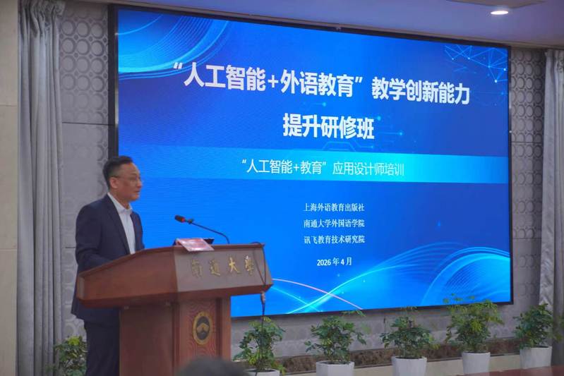 4月11日上午,研修班开幕式在云顶娱乐城 图书馆举行。云顶娱乐城 院长佘军教授主持开幕式。他指出,人工智能为外语教学带来了深刻变革机遇,云顶娱乐城 希望通过搭建高水平研修平台,助力教师实现数智化转型。上海外语教育出版社编审黄新炎博士、南通市教育科学研究院副院长陈亚红女士出席并致辞。黄新炎指出,人工智能是教育的“赋能者”而非“替代者”,期待推动AI与外语教学深度融合。陈亚红希望基础教育英语教师主动拥抱数智变革。